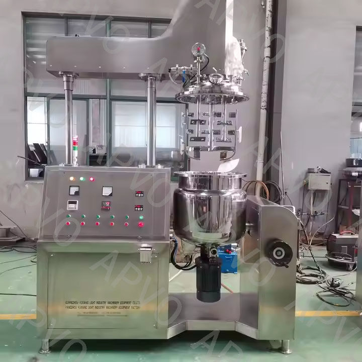 この機械は、水相と油相の別々のタンク内で材料を加熱し、撹拌することによって動作します。十分に混合した後、材料は真空ポンプを介して乳化タンクに送られます。中央のパドルとPTFEスクレーパーは、材料を高速乳化機に押し込みながら完全な混合を保証し、粒子を所望のミクロンサイズに切断、せん断、および破壊します。