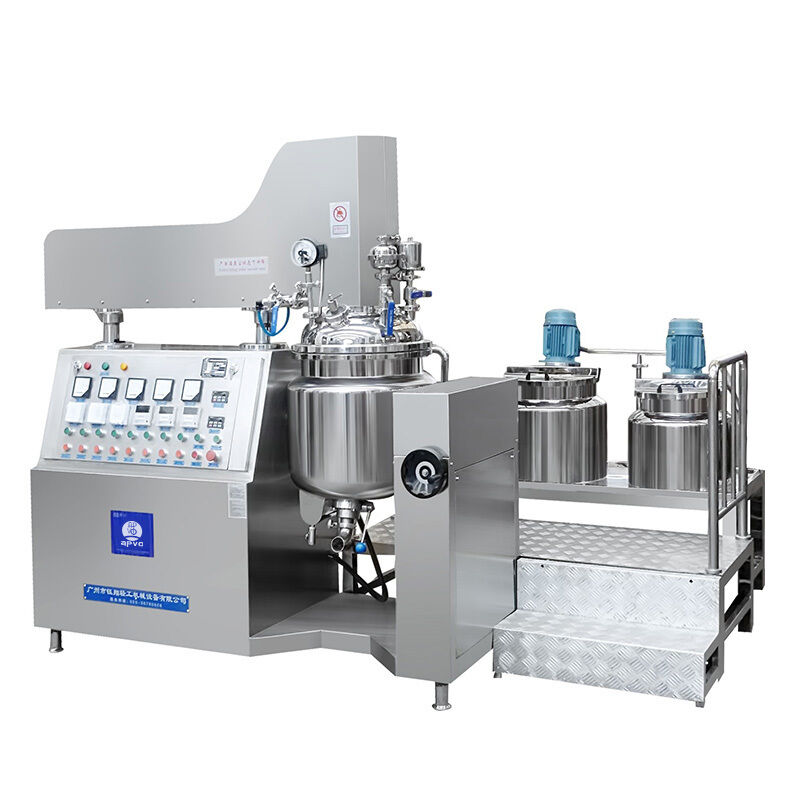 La máquina tiene triple mezclador, cubierta de elevación hidráulica, homogeneizador de alta velocidad (la velocidad es de 0-3500r/min, regulación de velocidad de frecuencia). El mezclador de emulsificación de vórtice de corte rápido se utiliza en la parte de homogeneidad, que puede raspar a baja velocidad y mezclar y acurrucarse automáticamente en la parte inferior y la pared de la caldera. La máquina extrae material de potencia por medio del vacío para evitar que el polvo vuele. Todo el procedimiento de trabajo se opera en condiciones de vacío para evitar que el material entre en burbujas después de la mezcla a alta velocidad y alcanzar la solicitud de saneamiento y asepsia. El sistema de limpieza CIP está equipado en este sistema. La parte de contacto del recipiente y el material está hecha de material SUS316L. El acabado espejo de la superficie interior es 300EMSH. En productos de la empresa alemana Siemens, el botón es producido por la empresa japonesa Fuji, el transductor es el producto de la empresa japonesa Matsushita Electric Industries y la parte de control eléctrico es el producto de la empresa Siemens. La máquina está hecha completamente de acuerdo con la solicitud GMP, que es el equipo de producción de crema más avanzado y perfecto.